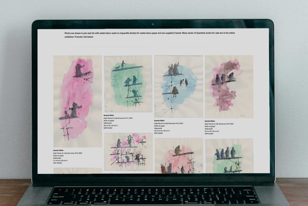 Sir Quentin Blake’s Online Viewing Room. Some of the pieces have been sold, which you can mark with a red dot, the standard for art sales everywhere.